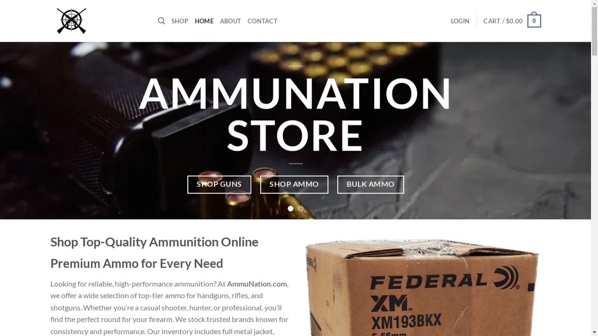 Skip to content 0 AMMUNATION STORE SHOP GUNS SHOP AMMO BULK AMMO Shop Top-Quality Ammunition Online Premium Ammo for Every Need Looking for reliable, high-performance ammunition? At AmmuNation.com, we offer a wide selection of top-tier ammo for handguns, rifles, and shotguns. Whether you re a casual shooter, hunter, or professional, you ll find the perfect round for your firearm. We stock trusted brands known for consistency and performance. Our inventory includes full metal jacket, hollow point, and specialty rounds. Every product is tested and approved for quality. With us, you never compromise on safety or reliability. At Ammunation.com, we are committed to providing firearm enthusiasts, hunters, and professionals with top-quality ammunition and exceptional service. Here s why we stand out Why Shop With AmmuNation.com? 1. Competitive Prices and Exclusive Deals We understand the value of your money. That s why we offer affordable prices without sacrificing quality. Our bulk ammo deals, clearance items, and seasonal discounts help you stock up and save big. 2. Fast, Discreet Shipping Nationwide We ship quickly and securely across the U.S. All orders are packed discreetly and tracked for peace of mind. Need ammo in a hurry? Choose our express shipping options and get it delivered fast. 3. Trusted by Thousands of Shooters Customer satisfaction is our mission. Our verified reviews speak volumes about the trust we ve built. Join thousands of shooters who rely on us for dependable ammunition and exceptional service. 4. Secure Payments and Hassle-Free Returns Your privacy and security are guaranteed. We use encrypted checkout for safe transactions. Not happy with your order? Our easy return policy ensures you can shop confidently. BULK AMMO BULK AMMO .223 Rem G9 Defense 54 Grain Barrier Blind Solid Copper HP 200 Rounds BULK AMMO 223 Rem PMC Bronze 55 Grain FMJ 1000 Rounds BULK AMMO 223 Rem Federal American Eagle 62 Gr. FMJ 500 Rounds PRIMERS PRIMERS FEDERAL #100 SMALL PISTOL CHAMPION PRIMER FED100 $8.29 PRIMERS CCI #400 SMALL RIFLE PRIMER CCI0013 $7.99 PRIMERS CHEDDITE 209 SHOTSHELL PRIMER CH209 $5.49 Join Our Ammo Community Subscribe to our newsletter and get early access to new arrivals, flash sales, and expert shooting tips. We reward loyalty. Sign up today and receive an instant discount on your first order. Our Promise: Ammo You Can Trust At AmmuNation.com, we don t just sell ammo. We deliver confidence, safety, and performance in every box. Our dedicated support team is always ready to assist. Whether you re a first-time buyer or a seasoned gun owner, we re here to help every step of the way. Start Shopping Now Don t wait. Stock up on reliable ammunition today and experience the AmmuNation difference. Visit our catalog, place your order, and join the thousands who trust us for all their shooting needs. BROWSE OUR CATEGORIES BULK AMMO 200 PRODUCTS GUNS 602 PRODUCTS This was my first time ordering from AmmunitionStore, and I was blown away. Not only is the Rare Breed Trigger absolutely top-tier in performance, but the buying experience was seamless. The site is trustworthy, delivery was quick, and customer support was responsive. Can t ask for more. Rebecca Smith LATEST 5.56 NATO – MaxxTech 55 Grain Full Metal Jacket Case 5.56 NATO – Lake City 62 GR. Green Tip Stripper Clipped 1,000 rd. can 5.56 NATO – MaxxTech 62 Grain M855 Green Tip 1,000 rds. Case 5.56 NATO – Lake City 55 Grain M193 FMJ – 1000 Rounds BEST SELLING WINCHESTER USA 9MM 115 GR FMJ 50-RNDS/BOX 1000-RNDS/CASE USA417250 $11.99 FN AMMO 5.7 X 28 MM 40 GR FMJ 50-RNDS/BOX 500-RNDS/CASE 10700031 $29.99 FIOCCHI 5.7X28MM 41 GR FMJ 150 ROUNDS/BOX 57FMJ40 $69.99 REMINGTON PISTOL AMMO 9MM 124 GR FMJ 50-RNDS/BOX 1000-RNDS/CASE T9MM2L $12.99 TOP RATED WINCHESTER USA 9MM 115 GR FMJ 50-RNDS/BOX 1000-RNDS/CASE USA417250 $11.99 FN AMMO 5.7 X 28 MM 40 GR FMJ 50-RNDS/BOX 500-RNDS/CASE 10700031 $29.99 FIOCCHI 5.7X28MM 41 GR FMJ 150 ROUNDS/BOX 57FMJ40 $69.99 ABOUT US Whether you’re a seasoned shooter or just starting out, Ammunation.com is your trusted partner for all things ammunition. Explore our offerings and discover the quality and service that set us apart. LATEST NEWS 07 May Tired of shooting at static targets at the range? 3 Comments 04 May Mapping the Main Processes & Theory Lessons 30 Apr All Types of Bullets and Weapon Cleaning 26 Apr Weapon Licence: Who Can Carry Consealed Guns TAGS ABOUT CONTACT Copyright 2025 AMMUNATIONS
